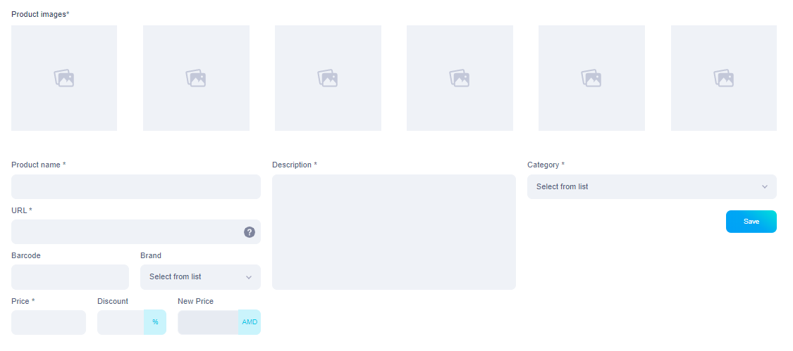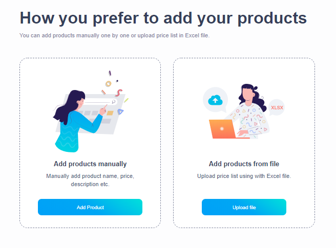 There are 3 ways of adding products - manually, uploading Exel file and Application Program Interface (API).