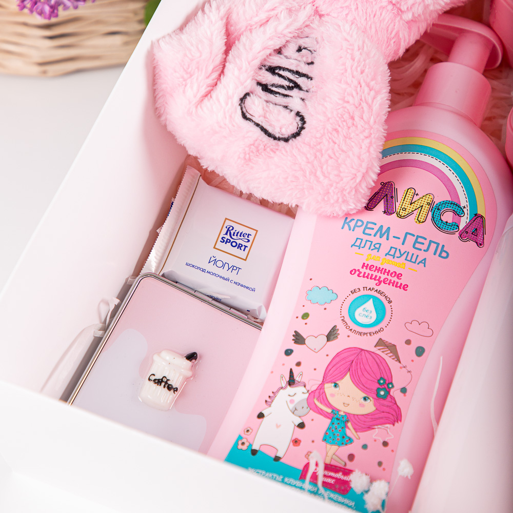 Պարունակությունը՝ Հայելի, Մազակալ, Դրամապանակ, Շոկոլադե կոնֆետ Ritter Sport, Թերմոս, Մանկական լոգանքի գել Ալիսա՝ 350մլ։ Տուփի նյութը՝ Ստվարաթուղթ։ Չափսը՝ Երկարություն՝ 19 սմ, Լայնություն՝ 26