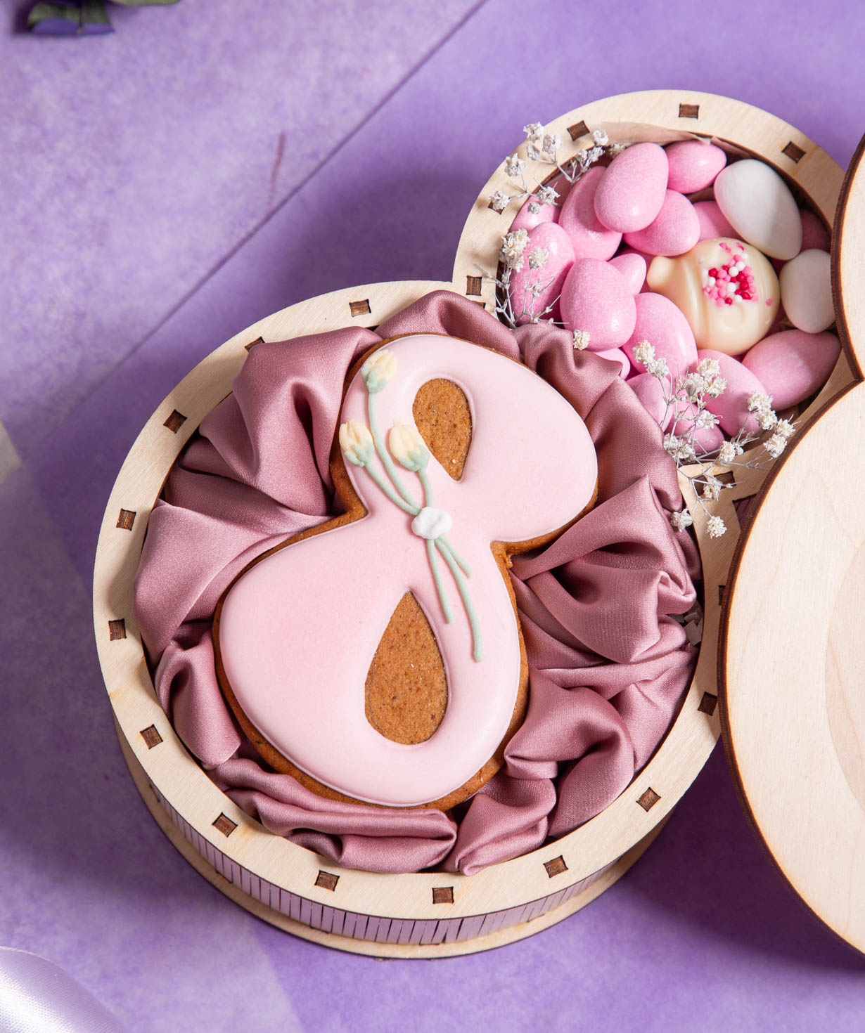 Պարունակությունը՝ թխվածքաբլիթ, մազակալ, դրաժե նուշով՝ 100 գ։ Տուփի չափերը՝ Բարձրություն 6 սմ. Տրամագիծ 13.50 սմ.