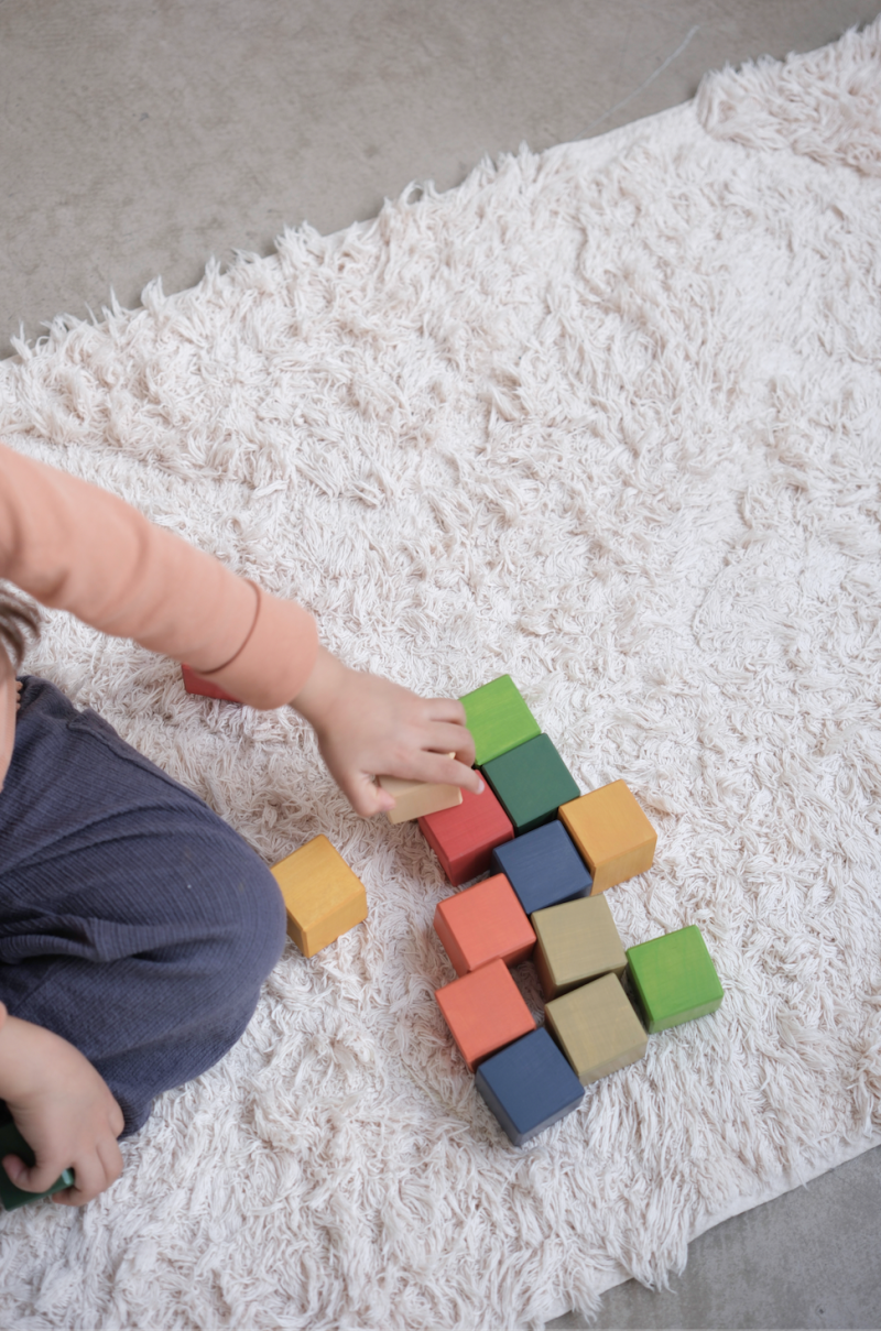 Փայտե խորանարդիկներ բաղկացած 16 կտորից, յուրաքանչյուրի չափսը 4x4x4 սմ: խաղալիքները պատրաստված են բացառապես բնական նյութերից: Ջրային հիմմունքով անուշաբույր օրգանական ներկը չի պարունակում գրգռիչ և էկոլոգիապես վնասող հավելումներ: