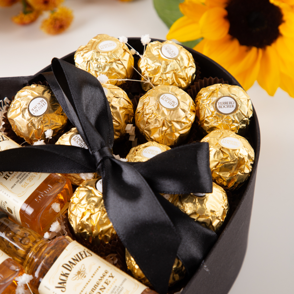 Պարունակությունը՝ Jack Daniels 50մլ վիսկի 3 հատ, Ferrero Rocher շոկոլադե կոնֆետ 12 հատ Տուփի նյութը՝ Ստվարաթուղթ Չափսը՝ Լայնություն՝ 8 սմ, Բարձրություն՝ 14 սմ։