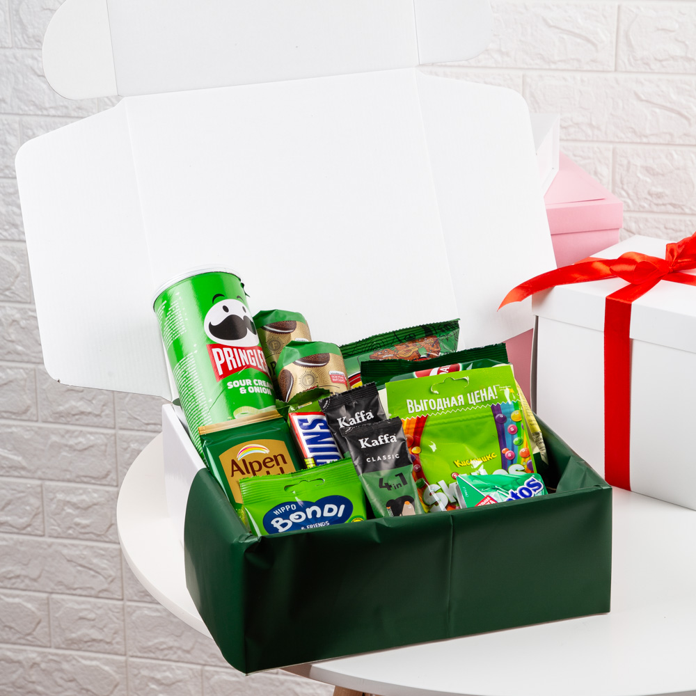Պարունակությունը՝ Չիփս Պրինգլս 165 գրամ, Կրուասան 7 Days 65 գրամ 1 հատ, Չորահաց 3 Կորոչկի 120 գրամ 2 հատ, Կոնֆետ Skittles 70 գրամ, Շոկոլադե սալիկ Alpen Gold 1 հատ․ Թխվածքաբլիթ Forsite 20 գրամ 2 հատ, Մաստակ Mentos, Ժելե Յաշկինո Բոնդի 30 գրամ, Շոկոլա