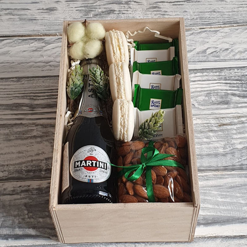 Պարունակությունը՝ Փրփրուն գինի Martini Asti՝ 200մլ, Շոկոլադե կոնֆետներ Ritter Sport՝ 6 հատ, Նուշ՝ 100գ։ Տուփի նյութը՝ Փայտ։ Չափսը՝ Երկարություն՝ 25 սմ, Լայնություն՝ 15 սմ, Բարձրություն՝ 7 սմ։