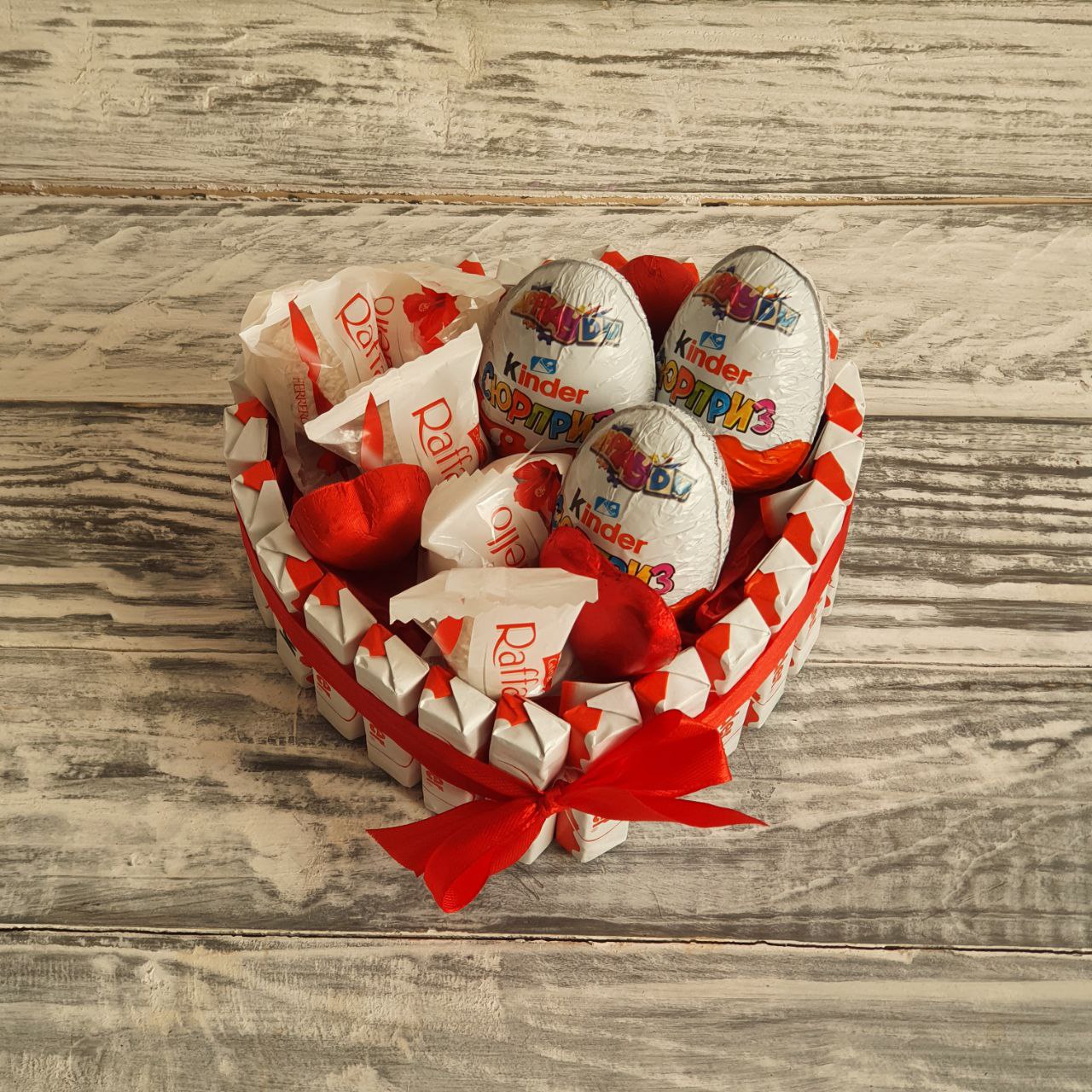 Պարունակությունը՝ Շոկոլադե կոնֆետներ Kinder` 29 հատ, Շոկոլադե ձվիկներ Kinder Surprise` 3 հատ, Կոնֆետներ Raffaello` 6 հատ , Շոկոլադե կոնֆետներ սրտիկ՝ 3 հատ։ Չափսը՝ Տրամագիծը՝ 15 սմ, Բարձրություն՝ 7 սմ։