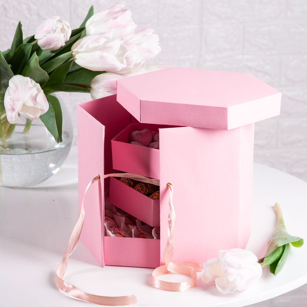Պարունակությունը՝ Շոկոլադե կոնֆետներ Ferrero Rocher` 20 հատ, Կոնֆետներ Raffaello` 20 հատ, Շոկոլադե կոնֆետներ Սրտիկ՝ 16 հատ։ Տուփի նյութը՝ Ստվարաթուղթ։ Չափսը՝ Տրամագիծ՝ 19 սմ, Բարձրություն՝ 20 ս