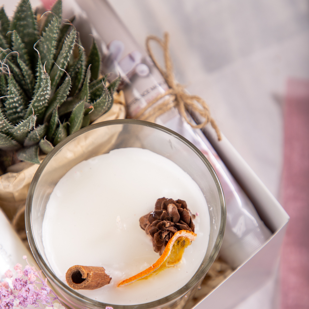 Պարունակությունը՝ Ձեռագործ մոմ, Դեմքի դիմակ կտորե 1 հատ, Բույս, Շամպույն 250մլ։ Տուփի նյութը՝ Ստվարաթուղթ։ Չափսը՝ Երկարություն - 15 սմ, Լայնություն - 15 սմ, Բարձրություն - 6 սմ։