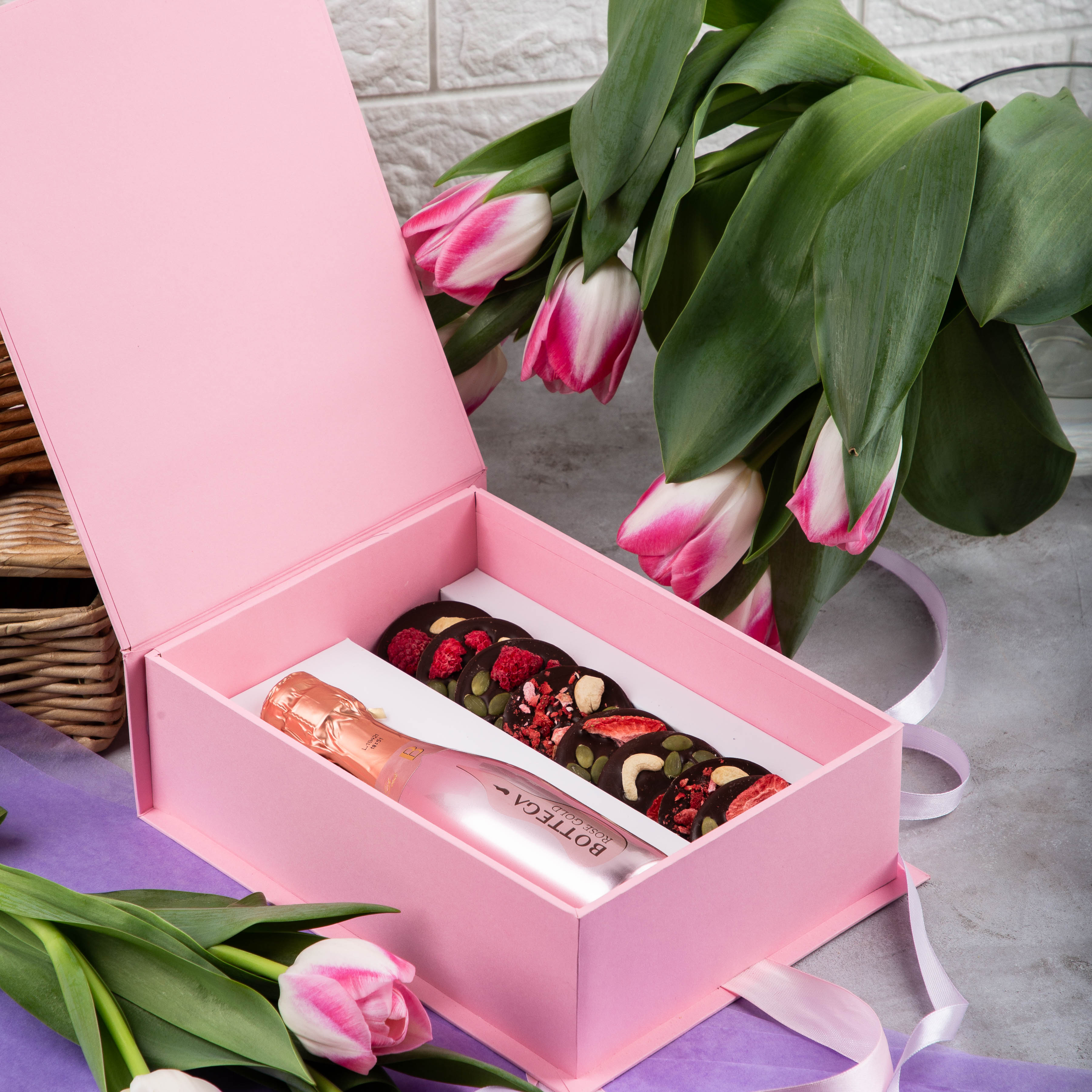 Պարունակությունը՝ Փրփրուն գինի 200 մլ, Ձեռագործ շոկոլադներ միդիանտներ 7 հատ։ Տուփի նյութը՝ Ստվարաթուղթ։ Չափսը՝ Երկարություն - 19,5 սմ, Լայնություն - 25 սմ։ Բարձրություն - 7,5սմ։