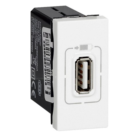 Разъемы для зарядки USB A-типа. Для подзарядки портативных устройств. Количество модулей: 1. Двойные гнезда USB - 5 В - 1,1 А - 5,5 Вт. Частота: 60 Гц. Максимальный выходной ток: 750 мА. Поставляется без шнура.